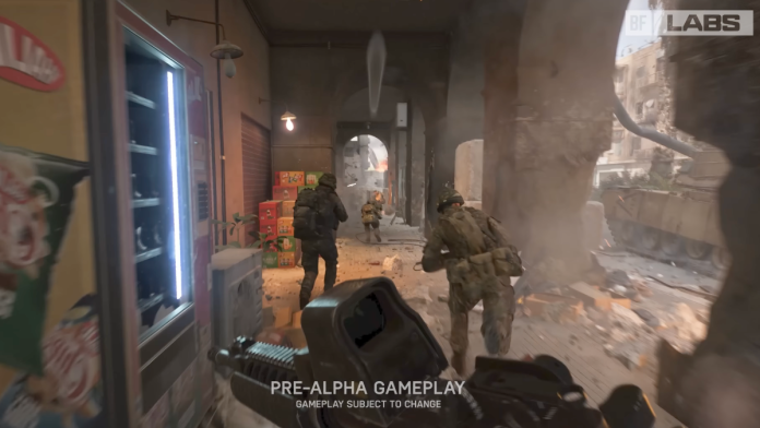 बॅटलफील्ड लॅबची घोषणा करणा video ्या व्हिडिओच्या शेवटी, ईएने पुढील रणांगणातून प्री-अल्फा गेमप्लेचा पदार्पण केला ज्याने विनाशकारी वातावरणासह एक प्रखर शहरी लढाऊ झोन दर्शविला.